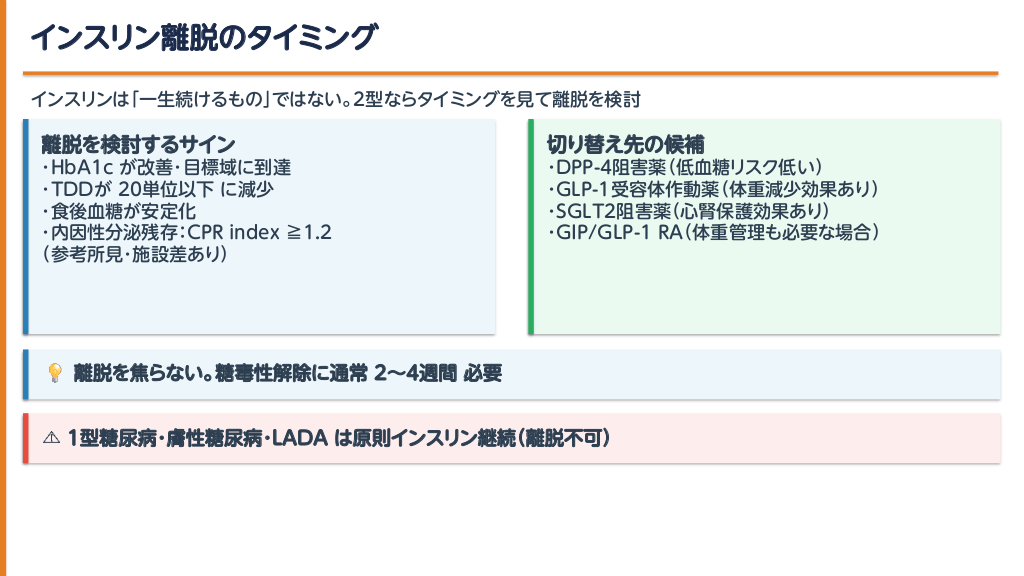 #26. インスリン離脱のタイミング インスリンは「一生続けるもの」ではない。2型ならタイミングを見て離脱を検討 離脱を検討するサイン 切り替え先の候補 ・HbA1c が改善・目標域に到達 ・TDDが 20単位以下 に減少 ・食後血糖が安定化 ・内因性分泌残存:CPR index ≧1.2 (参考所見・施設差あり) ・DPP-4阻害薬(低血糖リスク低い) ・GLP-1受容体作動薬(体重減少効果あり) ・SGLT2阻害薬(心腎保護効果あり) ・GIP/GLP-1 RA(体重管理も必要な場合) 離脱を焦らない。糖毒性解除に通常 2~4週間 必要 1型糖尿病・膚性糖尿病・LADA は原則インスリン継続(離脱不可)