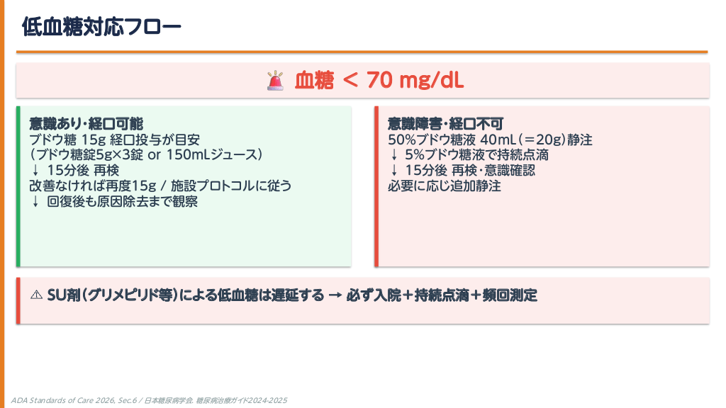 #28. 低血糖対応フロー 血糖 < 70 mg/dL 意識あり・経口可能 意識障害・経口不可 ブドウ糖 15g 経口投与が目安 (ブドウ糖錠5g×3錠 or 150mLジュース) ↓ 15分後 再検 改善なければ再度15g / 施設プロトコルに従う ↓ 回復後も原因除去まで観察 50%ブドウ糖液 40mL(=20g)静注 ↓ 5%ブドウ糖液で持続点滴 ↓ 15分後 再検・意識確認 必要に応じ追加静注 SU剤(グリメピリド等)による低血糖は遅延する → 必ず入院+持続点滴+頻回測定 ADA Standards of Care 2026, Sec.6 / 日本糖尿病学会. 糖尿病治療ガイド2024-2025