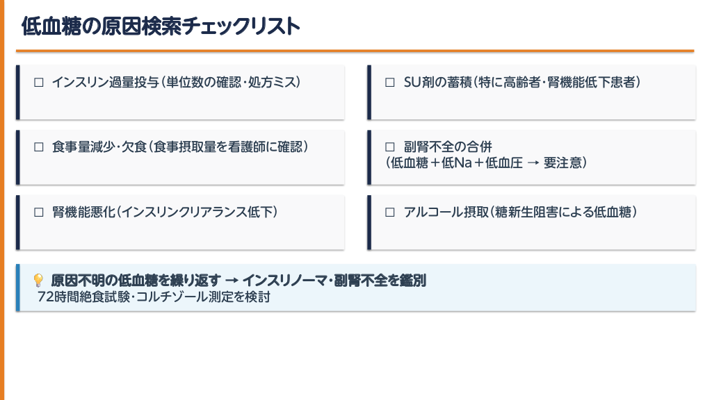 #29. 低血糖の原因検索チェックリスト ☐ インスリン過量投与(単位数の確認・処方ミス) ☐ SU剤の蓄積(特に高齢者・腎機能低下患者) ☐ 食事量減少・欠食(食事摂取量を看護師に確認) ☐ 副腎不全の合併 (低血糖+低Na+低血圧 → 要注意) ☐ 腎機能悪化(インスリンクリアランス低下) ☐ アルコール摂取(糖新生阻害による低血糖) 原因不明の低血糖を繰り返す → インスリノーマ・副腎不全を鑑別 72時間絶食試験・コルチゾール測定を検討