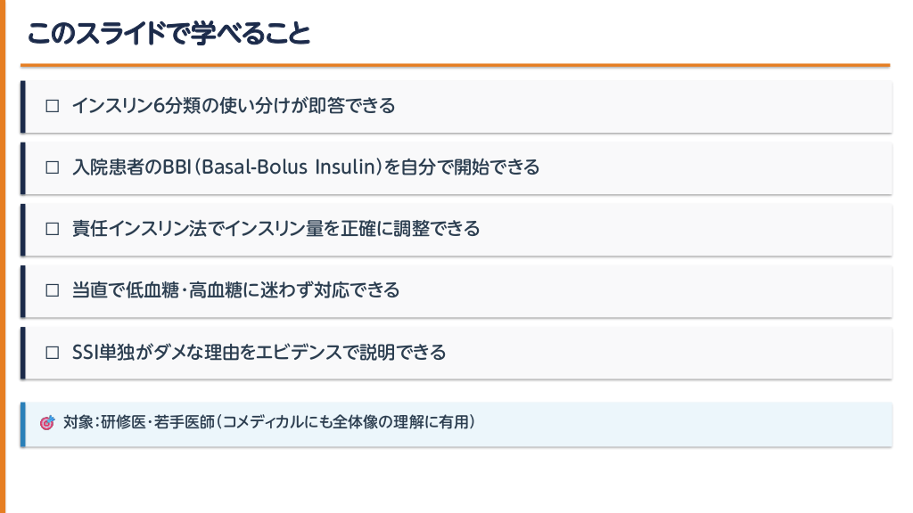#3. このスライドで学べること ☐ インスリン6分類の使い分けが即答できる ☐ 入院患者のBBI(Basal-Bolus Insulin)を自分で開始できる ☐ 責任インスリン法でインスリン量を正確に調整できる ☐ 当直で低血糖・高血糖に迷わず対応できる ☐ SSI単独がダメな理由をエビデンスで説明できる 対象:研修医・若手医師(コメディカルにも全体像の理解に有用)