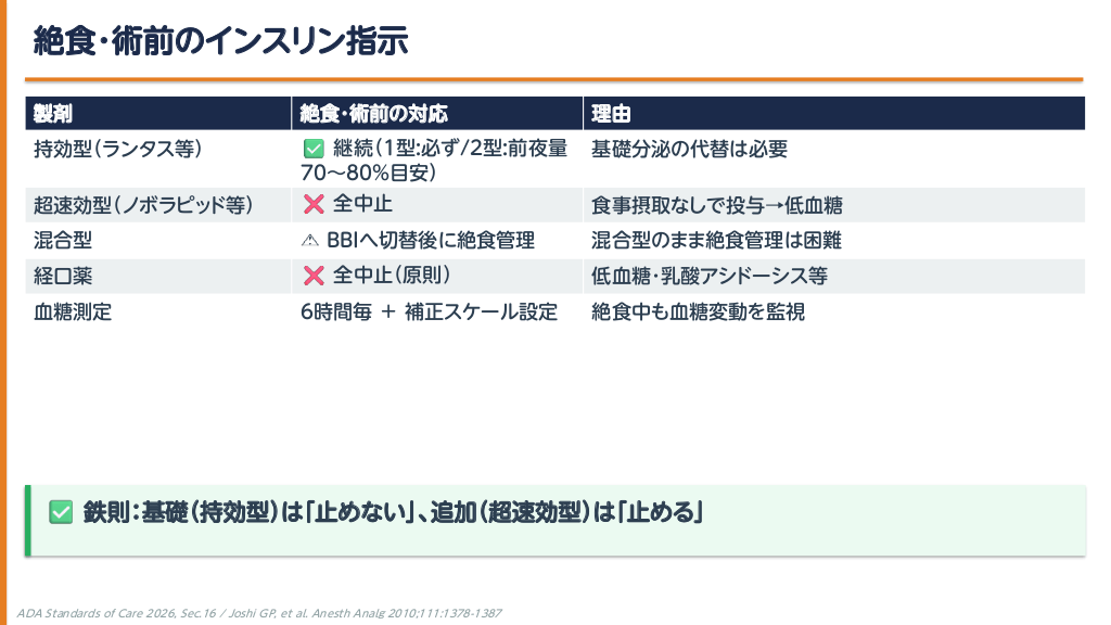 #30. 絶食・術前のインスリン指示 製剤 絶食・術前の対応 理由 持効型(ランタス等) 継続(1型:必ず/2型:前夜量 70~80%目安) 基礎分泌の代替は必要 超速効型(ノボラピッド等) 混合型 経口薬 血糖測定 全中止 BBIへ切替後に絶食管理 全中止(原則) 6時間毎 + 補正スケール設定 食事摂取なしで投与→低血糖 混合型のまま絶食管理は困難 低血糖・乳酸アシドーシス等 絶食中も血糖変動を監視 鉄則:基礎(持効型)は「止めない」、追加(超速効型)は「止める」 ADA Standards of Care 2026, Sec.16 / Joshi GP, et al. Anesth Analg 2010;111:1378-1387