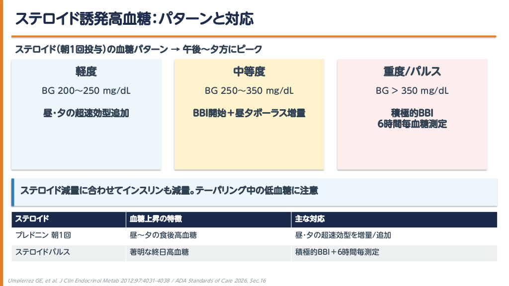 #31. ステロイド誘発高血糖:パターンと対応 ステロイド(朝1回投与)の血糖パターン → 午後~夕方にピーク 軽度 中等度 重度/パルス BG 200~250 mg/dL BG 250~350 mg/dL BG > 350 mg/dL 昼・夕の超速効型追加 BBI開始+昼夕ボーラス増量 積極的BBI 6時間毎血糖測定 ステロイド減量に合わせてインスリンも減量。テーパリング中の低血糖に注意 ステロイド 血糖上昇の特徴 主な対応 プレドニン 朝1回 昼~夕の食後高血糖 昼・夕の超速効型を増量/追加 ステロイドパルス 著明な終日高血糖 積極的BBI+6時間毎測定 Umpierrez GE, et al. J Clin Endocrinol Metab 2012;97:4031-4038 / ADA Standards of Care 2026, Sec.16