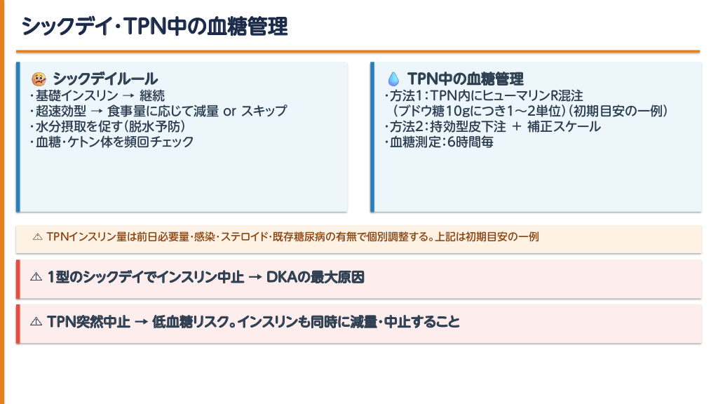 #32. シックデイ・TPN中の血糖管理 シックデイルール ・基礎インスリン → 継続 ・超速効型 → 食事量に応じて減量 or スキップ ・水分摂取を促す(脱水予防) ・血糖・ケトン体を頻回チェック TPN中の血糖管理 ・方法1:TPN内にヒューマリンR混注 (ブドウ糖10gにつき1~2単位)(初期目安の一例) ・方法2:持効型皮下注 + 補正スケール ・血糖測定:6時間毎 TPNインスリン量は前日必要量・感染・ステロイド・既存糖尿病の有無で個別調整する。上記は初期目安の一例 1型のシックデイでインスリン中止 → DKAの最大原因 TPN突然中止 → 低血糖リスク。インスリンも同時に減量・中止すること