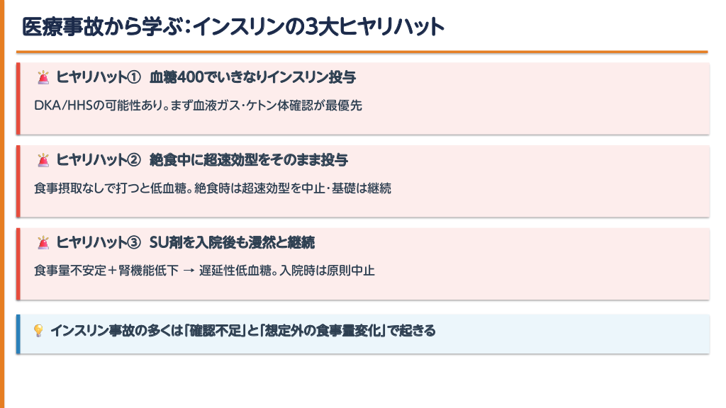 #33. 医療事故から学ぶ:インスリンの3大ヒヤリハット ヒヤリハット① 血糖400でいきなりインスリン投与 DKA/HHSの可能性あり。まず血液ガス・ケトン体確認が最優先 ヒヤリハット② 絶食中に超速効型をそのまま投与 食事摂取なしで打つと低血糖。絶食時は超速効型を中止・基礎は継続 ヒヤリハット③ SU剤を入院後も漫然と継続 食事量不安定+腎機能低下 → 遅延性低血糖。入院時は原則中止 インスリン事故の多くは「確認不足」と「想定外の食事量変化」で起きる