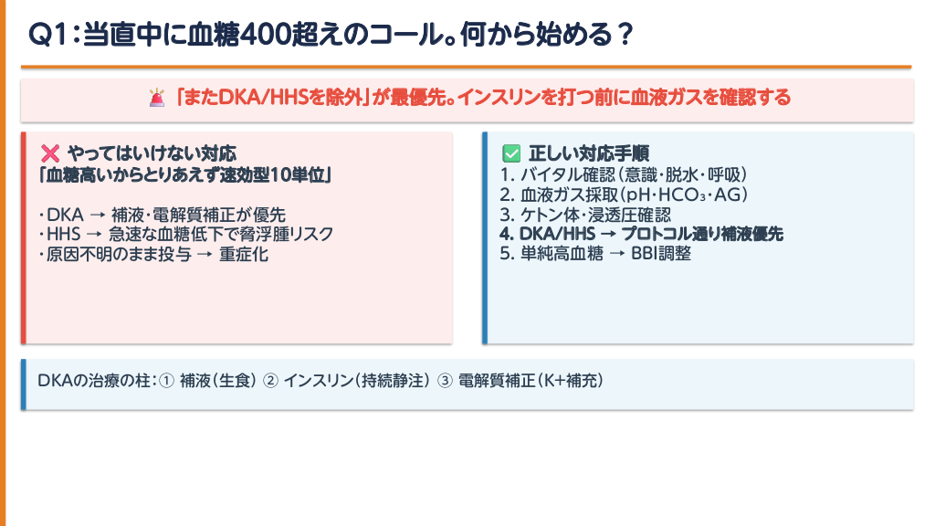 #35. Q1:当直中に血糖400超えのコール。何から始める? 「またDKA/HHSを除外」が最優先。インスリンを打つ前に血液ガスを確認する やってはいけない対応 「血糖高いからとりあえず速効型10単位」 ・DKA → 補液・電解質補正が優先 ・HHS → 急速な血糖低下で脅浮腫リスク ・原因不明のまま投与 → 重症化 正しい対応手順 1. バイタル確認(意識・脱水・呼吸) 2. 血液ガス採取(pH・HCO₃・AG) 3. ケトン体・浸透圧確認 4. DKA/HHS → プロトコル通り補液優先 5. 単純高血糖 → BBI調整 DKAの治療の柱:① 補液(生食) ② インスリン(持続静注) ③ 電解質補正(K+補充)