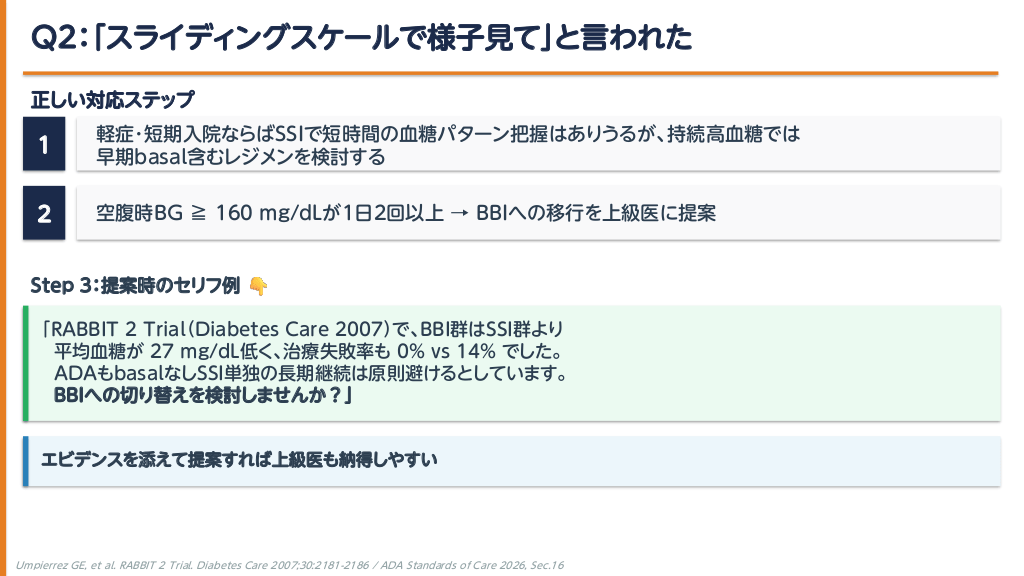 #36. Q2:「スライディングスケールで様子見て」と言われた 正しい対応ステップ 1 軽症・短期入院ならばSSIで短時間の血糖パターン把握はありうるが、持続高血糖では 早期basal含むレジメンを検討する 2 空腹時BG ≧ 160 mg/dLが1日2回以上 → BBIへの移行を上級医に提案 Step 3:提案時のセリフ例 「RABBIT 2 Trial(Diabetes Care 2007)で、BBI群はSSI群より 平均血糖が 27 mg/dL低く、治療失敗率も 0% vs 14% でした。 ADAもbasalなしSSI単独の長期継続は原則避けるとしています。 BBIへの切り替えを検討しませんか?」 エビデンスを添えて提案すれば上級医も納得しやすい Umpierrez GE, et al. RABBIT 2 Trial. Diabetes Care 2007;30:2181-2186 / ADA Standards of Care 2026, Sec.16