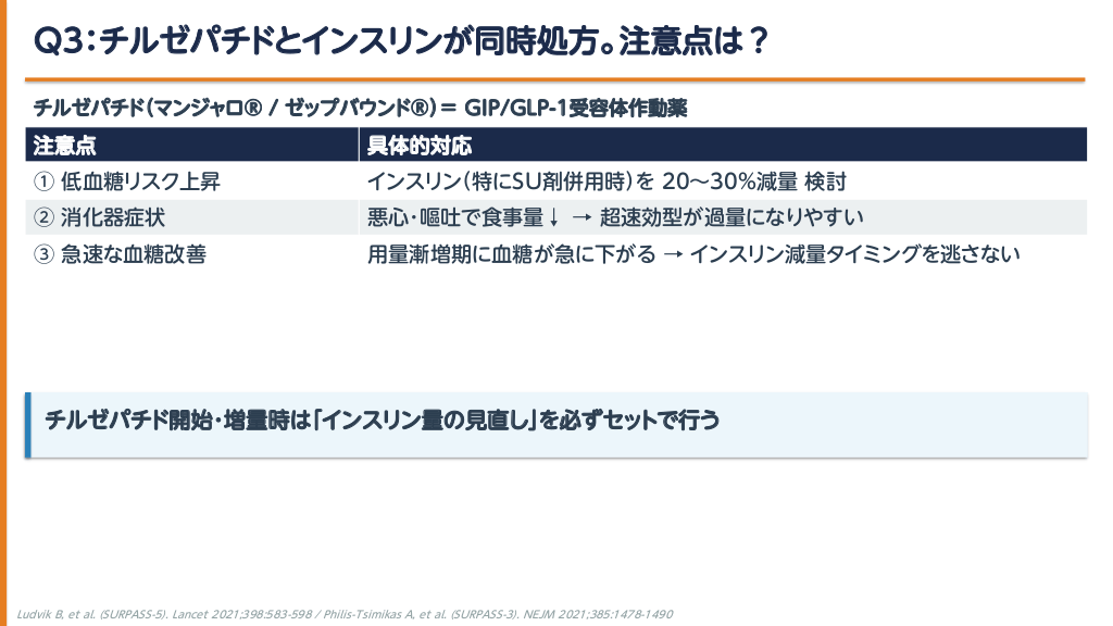 #37. Q3:チルゼパチドとインスリンが同時処方。注意点は? チルゼパチド(マンジャロ® / ゼップバウンド®)= GIP/GLP-1受容体作動薬 注意点 具体的対応 ① 低血糖リスク上昇 インスリン(特にSU剤併用時)を 20~30%減量 検討 ② 消化器症状 悪心・嘔吐で食事量↓ → 超速効型が過量になりやすい ③ 急速な血糖改善 用量漸増期に血糖が急に下がる → インスリン減量タイミングを逃さない チルゼパチド開始・増量時は「インスリン量の見直し」を必ずセットで行う Ludvik B, et al. (SURPASS-5). Lancet 2021;398:583-598 / Philis-Tsimikas A, et al. (SURPASS-3). NEJM 2021;385:1478-1490