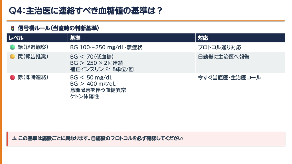 #38. Q4:主治医に連絡すべき血糖値の基準は? 信号機ルール(当直時の判断基準) レベル 基準 対応 緑(経過観察) BG 100~250 mg/dL・無症状 プロトコル通り対応 黄(報告推奨) BG < 70(低血糖) BG > 250 × 2回連続 補正インスリン ≧ 8単位/回 日勤帯に主治医へ報告 赤(即時連絡) BG < 50 mg/dL BG > 400 mg/dL 意識障害を伴う血糖異常 ケトン体陽性 今すぐ当直医・主治医コール この基準は施設ごとに異なります。自施設のプロトコルを必ず確認してください
