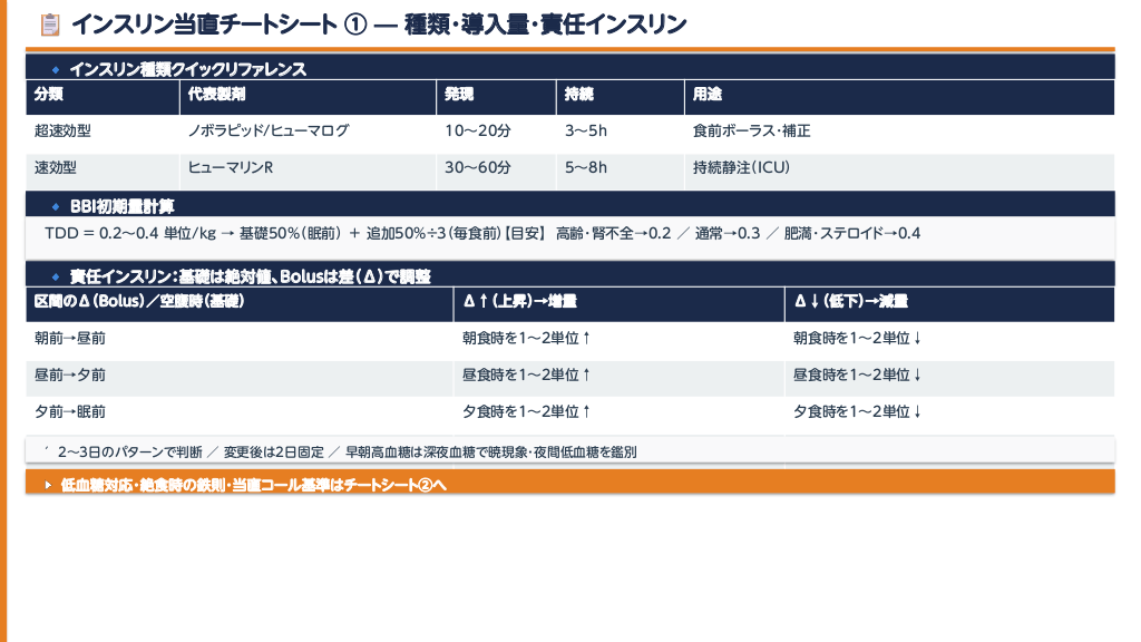 #40. インスリン当直チートシート ① — 種類・導入量・責任インスリン インスリン種類クイックリファレンス 分類 代表製剤 発現 持続 用途 超速効型 ノボラピッド/ヒューマログ 10~20分 3~5h 食前ボーラス・補正 速効型 ヒューマリンR 30~60分 5~8h 持続静注(ICU) 1~2h 24~42h 基礎インスリン 持効型BBI初期量計算 ランタス/トレシーバ TDD = 0.2~0.4 単位/kg → 基礎50%(眠前) + 追加50%÷3(毎食前)【目安】 高齢・腎不全→0.2 / 通常→0.3 / 肥満・ステロイド→0.4 責任インスリン:基礎は絶対値、Bolusは差(Δ)で調整 区間のΔ(Bolus)/空腹時(基礎) Δ↑(上昇)→増量 Δ↓(低下)→減量 朝前→昼前 朝食時を1~2単位↑ 朝食時を1~2単位↓ 昼前→夕前 昼食時を1~2単位↑ 昼食時を1~2単位↓ 夕前→眠前 夕食時を1~2単位↑ 夕食時を1~2単位↓ 早朝空腹時(目標80~130) 持効型を2単位↑ ′2~3日のパターンで判断 / 変更後は2日固定 / 早朝高血糖は深夜血糖で暁現象・夜間低血糖を鑑別 低血糖対応・絶食時の鉄則・当直コール基準はチートシート②へ 持効型を2単位↓