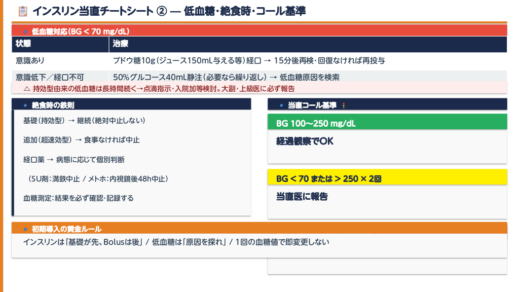 #41. インスリン当直チートシート ② — 低血糖・絶食時・コール基準 低血糖対応(BG < 70 mg/dL) 状態 治療 意識あり ブドウ糖10g(ジュース150mL与える等)経口 → 15分後再検・回復なければ再投与 意識低下/経口不可 50%グルコース40mL静注(必要なら繰り返し) → 低血糖原因を検索 持効型由来の低血糖は長時間続く→点滴指示・入院加等検討。大副・上級医に必ず報告 絶食時の鉄則 当直コール基準 基礎(持効型) → 継続(絶対中止しない) BG 100~250 mg/dL 追加(超速効型) → 食事なければ中止 経過観察でOK 経口薬 → 病態に応じて個別判断 (SU剤:満鉄中止 / メトホ:内視鏡後48h中止) 血糖測定:結果を必ず確認・記録する BG < 70 または > 250 × 2回 当直医に報告 初期導入の黄金ルール BG < 50、> 400、意識障害 インスリンは「基礎が先、Bolusは後」 / 低血糖は「原因を探れ」 / 1回の血糖値で即変更しない 即庁くコール