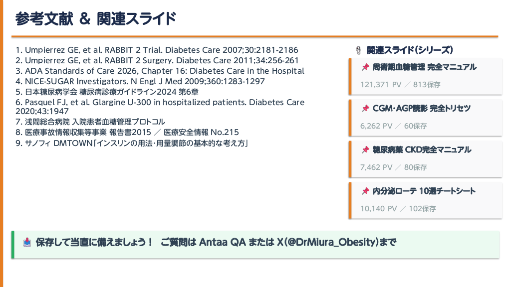 #42. 参考文献 & 関連スライド 1. Umpierrez GE, et al. RABBIT 2 Trial. Diabetes Care 2007;30:2181-2186 2. Umpierrez GE, et al. RABBIT 2 Surgery. Diabetes Care 2011;34:256-261 3. ADA Standards of Care 2026, Chapter 16: Diabetes Care in the Hospital 4. NICE-SUGAR Investigators. N Engl J Med 2009;360:1283-1297 5. 日本糖尿病学会 糖尿病診療ガイドライン2024 第6章 6. Pasquel FJ, et al. Glargine U-300 in hospitalized patients. Diabetes Care 2020;43:1947 7. 浅間総合病院 入院患者血糖管理プロトコル 8. 医療事故情報収集等事業 報告書2015 / 医療安全情報 No.215 9. サノフィ DMTOWN「インスリンの用法・用量調節の基本的な考え方」 関連スライド(シリーズ) 周術期血糖管理 完全マニュアル 121,371 PV / 813保存 CGM・AGP読影 完全トリセツ 6,262 PV / 60保存 糖尿病薬 CKD完全マニュアル 7,462 PV / 80保存 内分泌ローテ 10選チートシート 10,140 PV / 102保存 保存して当直に備えましょう! ご質問は Antaa QA または X(@DrMiura_Obesity)まで