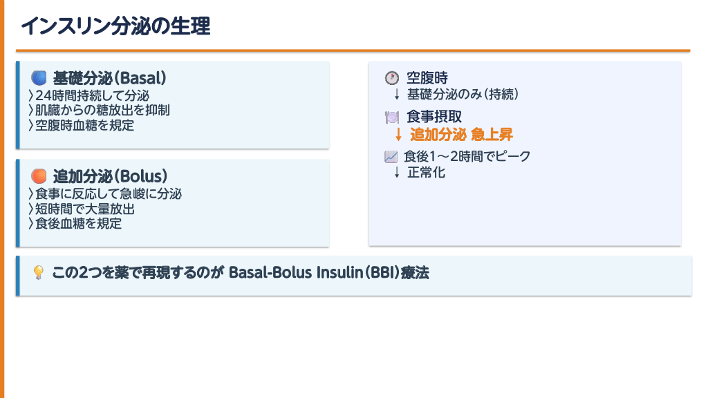 #5. インスリン分泌の生理 基礎分泌(Basal) 〉24時間持続して分泌 〉肌臓からの糖放出を抑制 〉空腹時血糖を規定 追加分泌(Bolus) 空腹時 ↓ 基礎分泌のみ(持続) 食事摂取 ↓ 追加分泌 急上昇 食後1~2時間でピーク ↓ 正常化 〉食事に反応して急峻に分泌 〉短時間で大量放出 〉食後血糖を規定 この2つを薬で再現するのが Basal-Bolus Insulin(BBI)療法