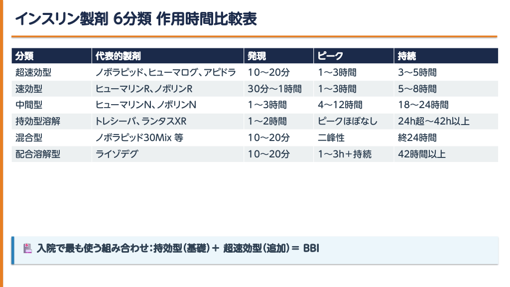 #6. インスリン製剤 6分類 作用時間比較表 分類 代表的製剤 発現 ピーク 持続 超速効型 ノボラピッド、ヒューマログ、アピドラ 10~20分 1~3時間 3~5時間 速効型 ヒューマリンR、ノボリンR 30分~1時間 1~3時間 5~8時間 中間型 ヒューマリンN、ノボリンN 1~3時間 4~12時間 18~24時間 持効型溶解 トレシーバ、ランタスXR 1~2時間 ピークほぼなし 24h超~42h以上 混合型 ノボラピッド30Mix 等 10~20分 二峰性 終24時間 配合溶解型 ライゾデグ 10~20分 1~3h+持続 42時間以上 入院で最も使う組み合わせ:持効型(基礎)+ 超速効型(追加)= BBI