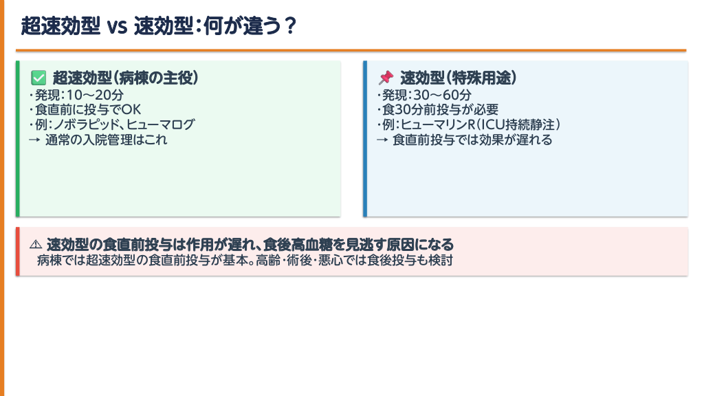 #7. 超速効型 vs 速効型:何が違う? 超速効型(病棟の主役) ・発現:10~20分 ・食直前に投与でOK ・例:ノボラピッド、ヒューマログ → 通常の入院管理はこれ 速効型(特殊用途) ・発現:30~60分 ・食30分前投与が必要 ・例:ヒューマリンR(ICU持続静注) → 食直前投与では効果が遅れる 速効型の食直前投与は作用が遅れ、食後高血糖を見逃す原因になる 病棟では超速効型の食直前投与が基本。高齢・術後・悪心では食後投与も検討