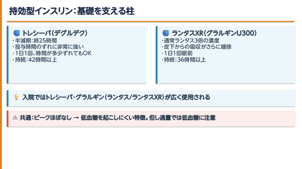 #8. 持効型インスリン:基礎を支える柱 トレシーバ(デグルデク) ・半減期:終25時間 ・投与時間のずれに非常に強い ・1日1回、時間が多少ずれてもOK ・持続:42時間以上 ランタスXR(グラルギンU300) ・通常ランタス3倍の濃度 ・皮下からの吸収がさらに緩徐 ・1日1回眠前 ・持続:36時間以上 入院ではトレシーバ・グラルギン(ランタス/ランタスXR)が広く使用される 共通:ピークほぼなし → 低血糖を起こしにくい特徴。但し過量では低血糖に注意