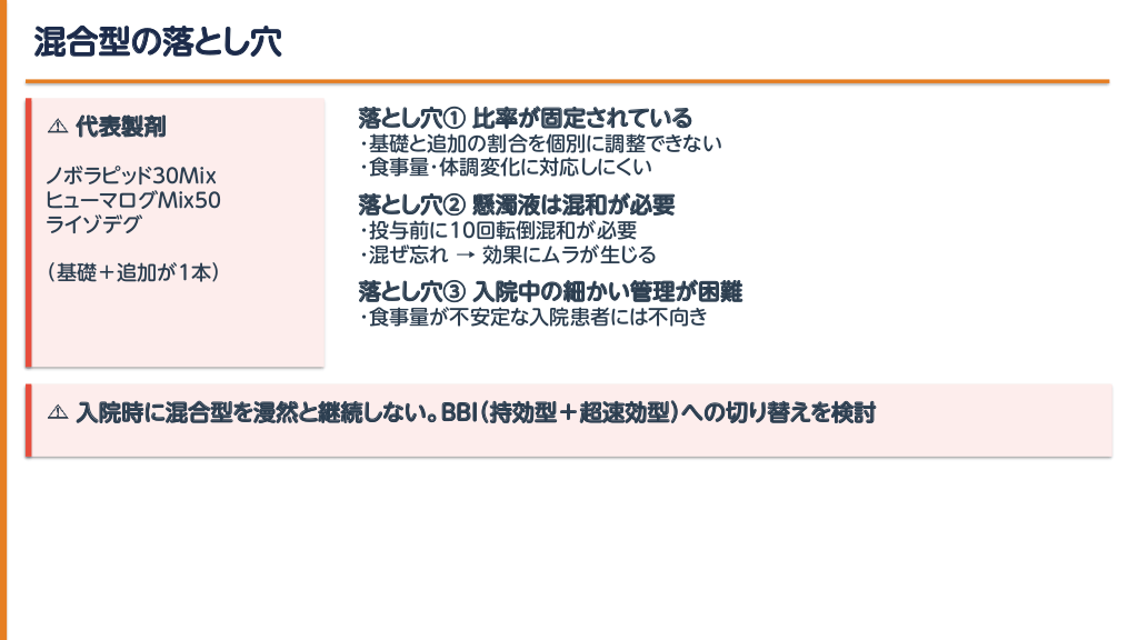 #9. 混合型の落とし穴 代表製剤 ノボラピッド30Mix ヒューマログMix50 ライゾデグ (基礎+追加が1本) 落とし穴① 比率が固定されている ・基礎と追加の割合を個別に調整できない ・食事量・体調変化に対応しにくい 落とし穴② 懸濁液は混和が必要 ・投与前に10回転倒混和が必要 ・混ぜ忘れ → 効果にムラが生じる 落とし穴③ 入院中の細かい管理が困難 ・食事量が不安定な入院患者には不向き 入院時に混合型を漫然と継続しない。BBI(持効型+超速効型)への切り替えを検討