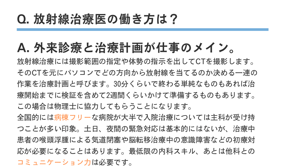 #10. Q. 放射線治療医の働き方は? A. 外来診療と治療計画が仕事のメイン。 放射線治療には撮影範囲の指定や体勢の指示を出してCTを撮影します。 そのCTを元にパソコンでどの方向から放射線を当てるのか決める一連の 作業を治療計画と呼びます。30分くらいで終わる単純なものもあれば治 療開始までに検証を含めて2週間くらいかけて準備するものもあります。 この場合は物理士に協力してもらうことになります。 全国的には病棟フリーな病院が大半で入院治療については主科が受け持 つことが多い印象。土日、夜間の緊急対応は基本的にはないが、治療中 患者の喉頭浮腫による気道閉塞や脳転移治療中の意識障害などの初療対 応が必要になることはあります。最低限の内科スキル、あとは他科との コミュニケーション力は必要です。