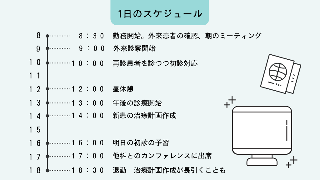 #12. 1日のスケジュール 8 8:30 勤務開始。外来患者の確認、朝のミーティング 9 9 :00 外来診察開始 10 10:00 再診患者を診つつ初診対応 11 12 12:00 昼休憩 13 13:00 午後の診療開始 14 14:00 新患の治療計画作成 15 16 16:00 明日の初診の予習 17 17:00 他科とのカンファレンスに出席 18 18:30 退勤 治療計画作成が長引くことも