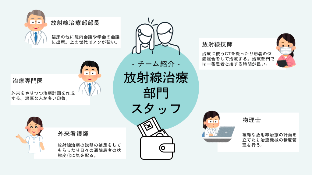 #13. 放射線治療部部長 臨床の他に院内会議や学会の会議 に出席。上の世代はアクが強い。 放射線技師 - チーム紹介 治療専門医 外来をやりつつ治療計画を作成 する。温厚な人が多い印象。 治療に使うCTを撮ったり患者の位 置照合をして治療する。治療部門で は一番患者と接する時間が長い。 放射線治療 部門 スタッフ 物理士 外来看護師 放射線治療の説明の補足をして もらったり日々の通院患者の状 態変化に気を配る。 複雑な放射線治療の計画を 立てたり治療機械の精度管 理を行う。
