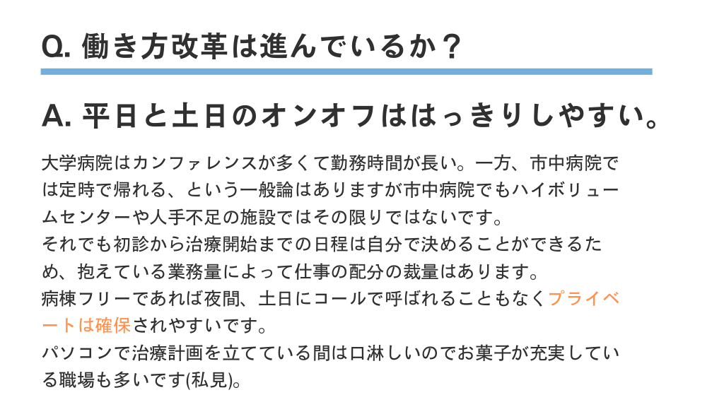 #14. Q. 働き方改革は進んでいるか? A. 平日と土日のオンオフははっきりしやすい。 大学病院はカンファレンスが多くて勤務時間が長い。一方、市中病院で は定時で帰れる、という一般論はありますが市中病院でもハイボリュー ムセンターや人手不足の施設ではその限りではないです。 それでも初診から治療開始までの日程は自分で決めることができるた め、抱えている業務量によって仕事の配分の裁量はあります。 病棟フリーであれば夜間、土日にコールで呼ばれることもなくプライベ ートは確保されやすいです。 パソコンで治療計画を立てている間は口淋しいのでお菓子が充実してい る職場も多いです(私見)。