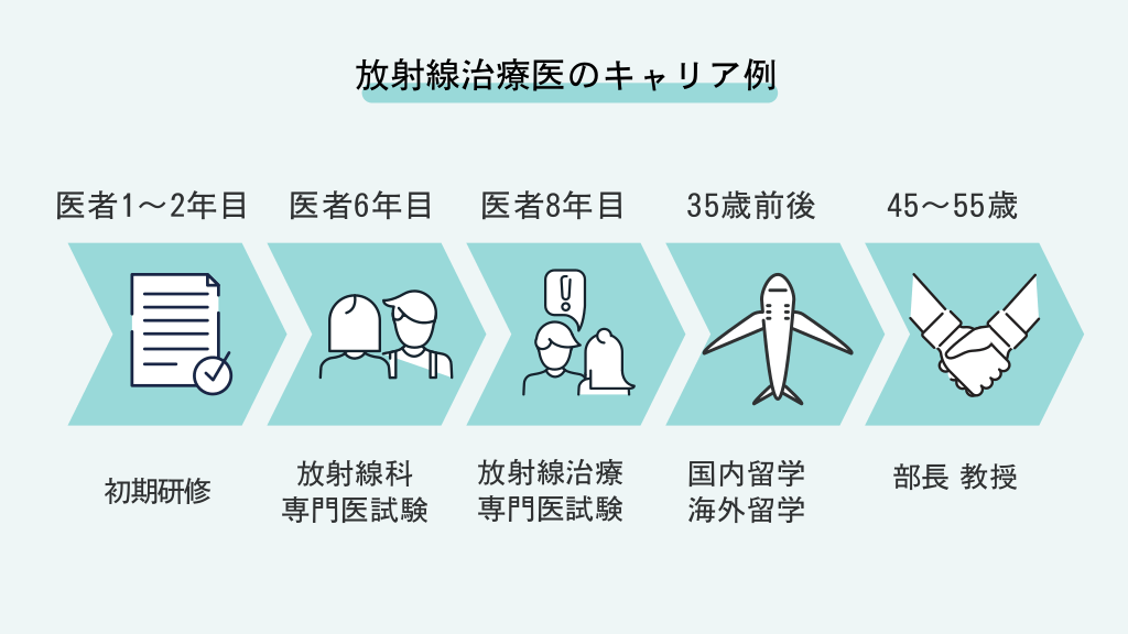 #15. 放射線治療医のキャリア例 医者1〜2年目 医者6年目 医者8年目 35歳前後 45〜55歳 初期研修 放射線科 専門医試験 放射線治療 専門医試験 国内留学 海外留学 部長 教授