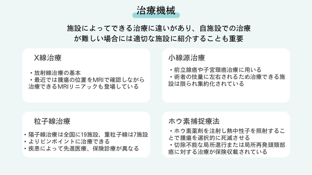 #17. 治療機械 施設によってできる治療に違いがあり、自施設での治療 が難しい場合には適切な施設に紹介することも重要 X線治療 ・放射線治療の基本 ・最近では腫瘍の位置をMRIで確認しながら 治療できるMRIリニアックも登場している 粒子線治療 ・陽子線治療は全国に19施設、重粒子線は7施設 ・よりピンポイントに治療できる ・疾患によって先進医療、保険診療が異なる 小線源治療 ・前立腺癌や子宮頸癌治療に用いる ・術者の技量に左右されるため治療できる施 設は限られ集約化されている ホウ素捕捉療法 ・ホウ素薬剤を注射し熱中性子を照射するこ とで腫瘍を選択的に死滅させる ・切除不能な局所進行または局所再発頭頸部 癌に対する治療が保険収載されている