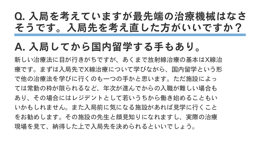 #18. Q. 入局を考えていますが最先端の治療機械はなさ そうです。入局先を考え直した方がいいですか? A. 入局してから国内留学する手もあり。 新しい治療法に目が行きがちですが、あくまで放射線治療の基本はX線治 療です。まずは入局先でX線治療について学びながら、国内留学という形 で他の治療法を学びに行くのも一つの手かと思います。ただ施設によっ ては常勤の枠が限られるなど、年次が進んでからの入職が難しい場合も あり、その場合にはレジデントとして若いうちから働き始めることもい いかもしれません。また入局前に気になる施設があれば見学に行くこと をお勧めします。その施設の先生と顔見知りになれますし、実際の治療 現場を見て、納得した上で入局先を決められるといいでしょう。
