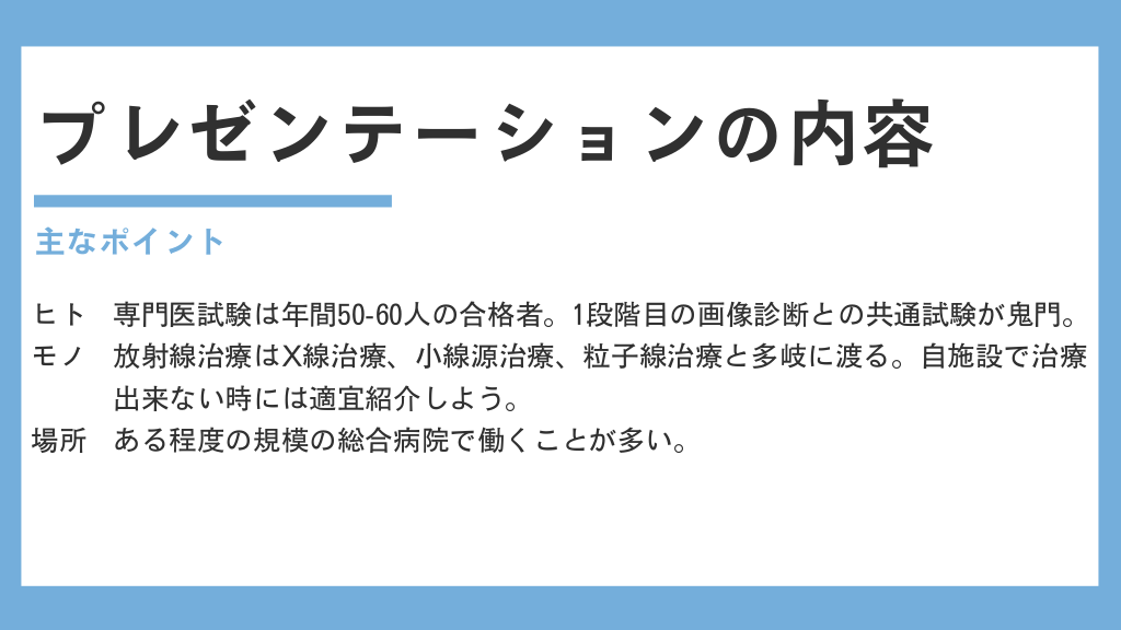 #2. プレゼンテーションの内容 主なポイント ヒト 専門医試験は年間50-60人の合格者。1段階目の画像診断との共通試験が鬼門。 モノ 放射線治療はX線治療、小線源治療、粒子線治療と多岐に渡る。自施設で治療 出来ない時には適宜紹介しよう。 場所 ある程度の規模の総合病院で働くことが多い。