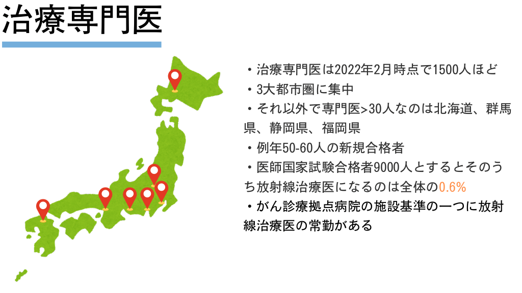 #20. 治療専門医 ・治療専門医は2022年2月時点で1500人ほど ・3大都市圏に集中 ・それ以外で専門医>30人なのは北海道、群馬 県、静岡県、福岡県 ・例年50-60人の新規合格者 ・医師国家試験合格者9000人とするとそのう ち放射線治療医になるのは全体の0.6% ・がん診療拠点病院の施設基準の一つに放射 線治療医の常勤がある