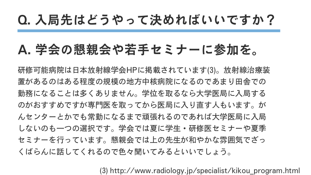 #21. Q. 入局先はどうやって決めればいいですか? A. 学会の懇親会や若手セミナーに参加を。 研修可能病院は日本放射線学会HPに掲載されています(3)。放射線治療装 置があるのはある程度の規模の地方中核病院になるのであまり田舎での 勤務になることは多くありません。学位を取るなら大学医局に入局する のがおすすめですが専門医を取ってから医局に入り直す人もいます。が んセンターとかでも常勤になるまで頑張れるのであれば大学医局に入局 しないのも一つの選択です。学会では夏に学生・研修医セミナーや夏季 セミナーを行っています。懇親会では上の先生が和やかな雰囲気でざっ くばらんに話してくれるので色々聞いてみるといいでしょう。 (3) http://www.radiology.jp/specialist/kikou_program.html