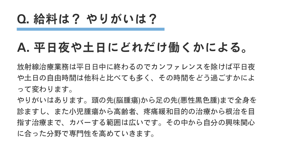 #22. Q. 給料は? やりがいは? A. 平日夜や土日にどれだけ働くかによる。 放射線治療業務は平日日中に終わるのでカンファレンスを除けば平日夜 や土日の自由時間は他科と比べても多く、その時間をどう過ごすかによ って変わります。 やりがいはあります。頭の先(脳腫瘍)から足の先(悪性黒色腫)まで全身を 診ますし、また小児腫瘍から高齢者、疼痛緩和目的の治療から根治を目 指す治療まで、カバーする範囲は広いです。その中から自分の興味関心 に合った分野で専門性を高めていきます。