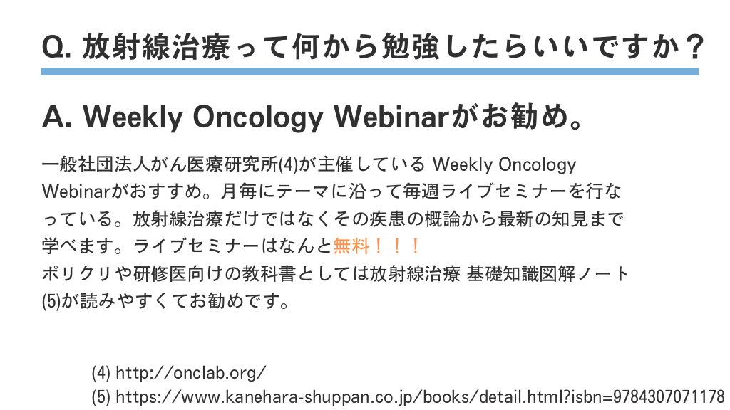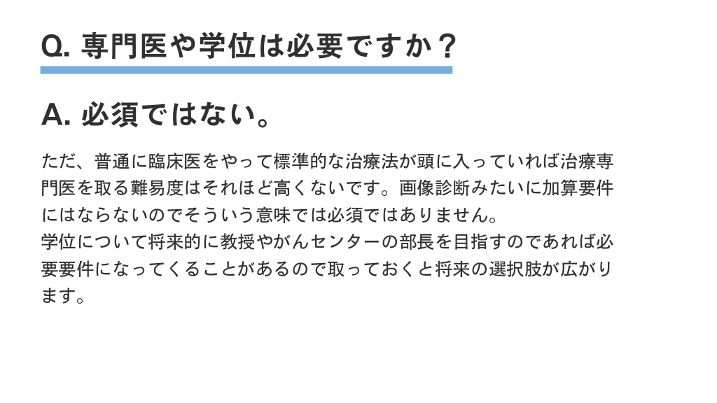 #24. Q. 専門医や学位は必要ですか? A. 必須ではない。 ただ、普通に臨床医をやって標準的な治療法が頭に入っていれば治療専 門医を取る難易度はそれほど高くないです。画像診断みたいに加算要件 にはならないのでそういう意味では必須ではありません。 学位について将来的に教授やがんセンターの部長を目指すのであれば必 要要件になってくることがあるので取っておくと将来の選択肢が広がり ます。