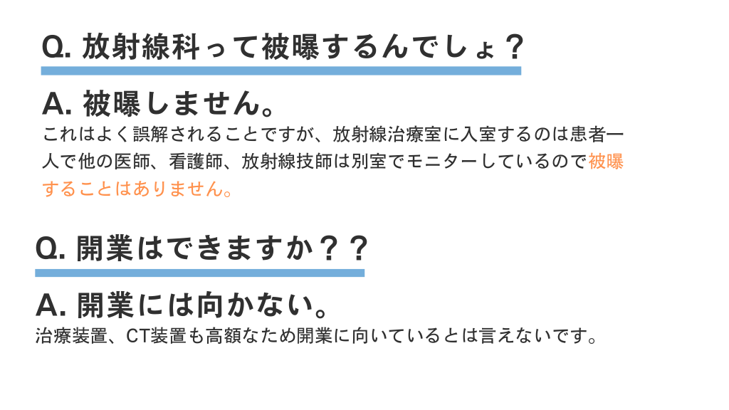 #25. Q. 放射線科って被曝するんでしょ? A. 被曝しません。 これはよく誤解されることですが、放射線治療室に入室するのは患者一 人で他の医師、看護師、放射線技師は別室でモニターしているので被曝 することはありません。 Q. 開業はできますか?? A. 開業には向かない。 治療装置、CT装置も高額なため開業に向いているとは言えないです。
