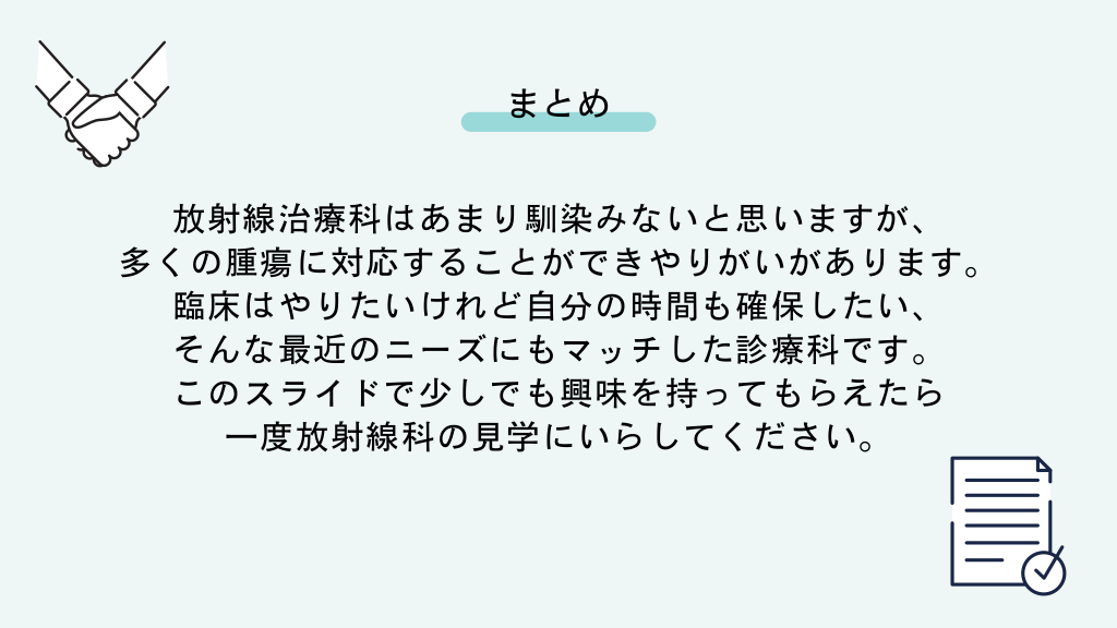 #26. まとめ 放射線治療科はあまり馴染みないと思いますが、 多くの腫瘍に対応することができやりがいがあります。 臨床はやりたいけれど自分の時間も確保したい、 そんな最近のニーズにもマッチした診療科です。 このスライドで少しでも興味を持ってもらえたら 一度放射線科の見学にいらしてください。