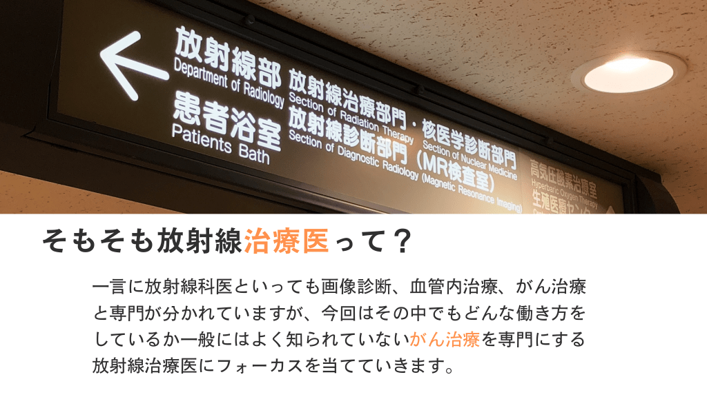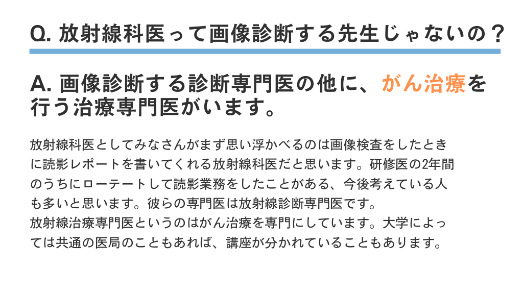 #3. そもそも放射線治療医って? 一言に放射線科医といっても画像診断、血管内治療、がん治療 と専門が分かれていますが、今回はその中でもどんな働き方を しているか一般にはよく知られていないがん治療を専門にする 放射線治療医にフォーカスを当てていきます。