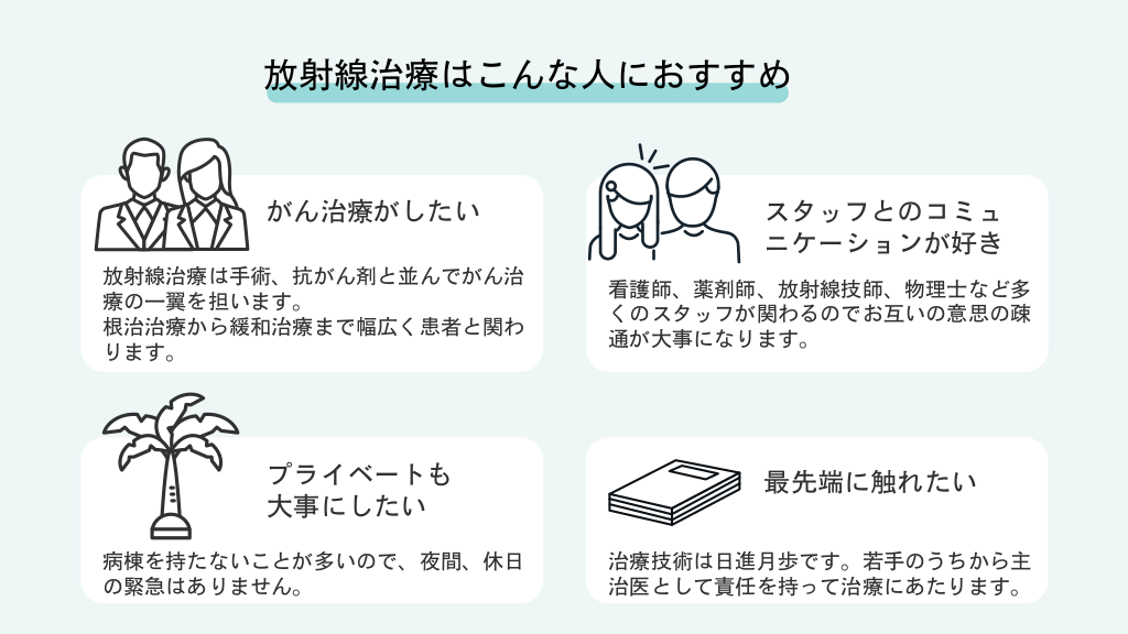 #4. 放射線治療はこんな人におすすめ がん治療がしたい 放射線治療は手術、抗がん剤と並んでがん治 療の一翼を担います。 根治治療から緩和治療まで幅広く患者と関わ ります。 プライベートも 大事にしたい 病棟を持たないことが多いので、夜間、休日 の緊急はありません。 スタッフとのコミュ ニケーションが好き 看護師、薬剤師、放射線技師、物理士など多 くのスタッフが関わるのでお互いの意思の疎 通が大事になります。 最先端に触れたい 治療技術は日進月歩です。若手のうちから主 治医として責任を持って治療にあたります。