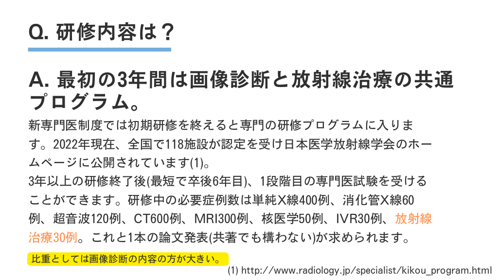 #7. Q. 研修内容は? A. 最初の3年間は画像診断と放射線治療の共通 プログラム。 新専門医制度では初期研修を終えると専門の研修プログラムに入りま す。2022年現在、全国で118施設が認定を受け日本医学放射線学会のホー ムページに公開されています(1)。 3年以上の研修終了後(最短で卒後6年目)、1段階目の専門医試験を受ける ことができます。研修中の必要症例数は単純X線400例、消化管X線60 例、超音波120例、CT600例、MRI300例、核医学50例、IVR30例、放射線 治療30例。これと1本の論文発表(共著でも構わない)が求められます。 比重としては画像診断の内容の方が大きい。 (1) http://www.radiology.jp/specialist/kikou_program.html