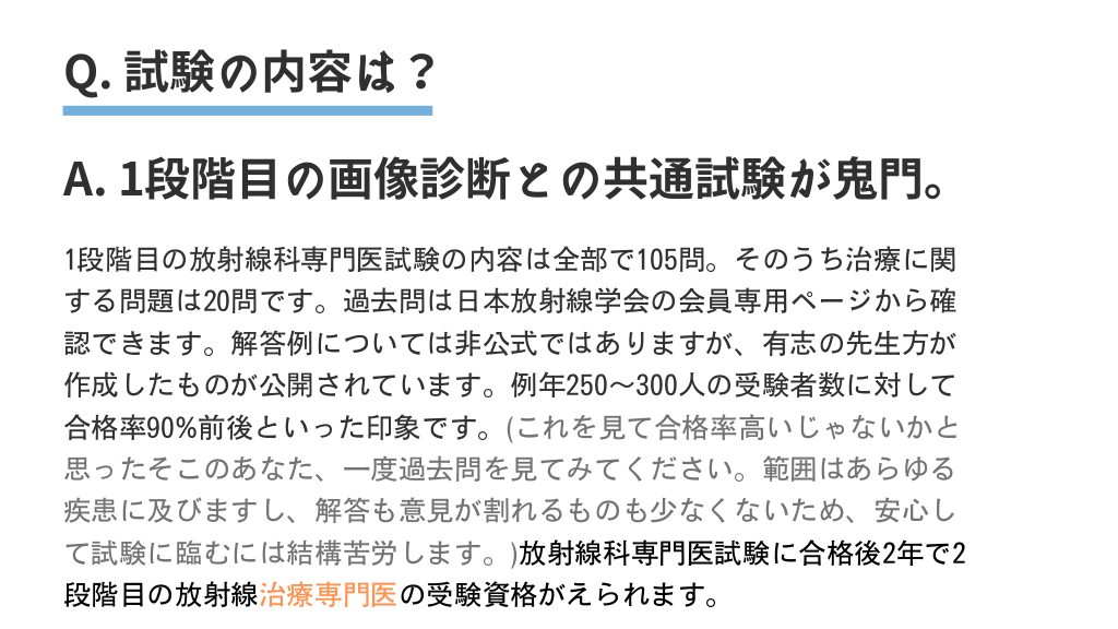 #8. Q. 試験の内容は? A. 1段階目の画像診断との共通試験が鬼門。 1段階目の放射線科専門医試験の内容は全部で105問。そのうち治療に関 する問題は20問です。過去問は日本放射線学会の会員専用ページから確 認できます。解答例については非公式ではありますが、有志の先生方が 作成したものが公開されています。例年250〜300人の受験者数に対して 合格率90%前後といった印象です。(これを見て合格率高いじゃないかと 思ったそこのあなた、一度過去問を見てみてください。範囲はあらゆる 疾患に及びますし、解答も意見が割れるものも少なくないため、安心し て試験に臨むには結構苦労します。)放射線科専門医試験に合格後2年で2 段階目の放射線治療専門医の受験資格がえられます。