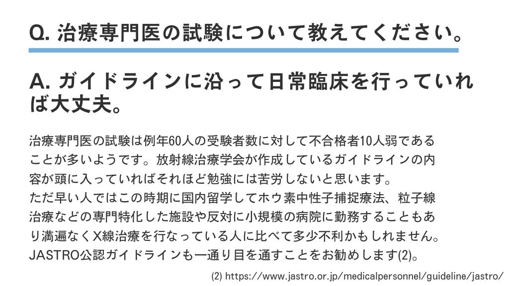 #9. Q. 治療専門医の試験について教えてください。 A. ガイドラインに沿って日常臨床を行っていれ ば大丈夫。 治療専門医の試験は例年60人の受験者数に対して不合格者10人弱である ことが多いようです。放射線治療学会が作成しているガイドラインの内 容が頭に入っていればそれほど勉強には苦労しないと思います。 ただ早い人ではこの時期に国内留学してホウ素中性子捕捉療法、粒子線 治療などの専門特化した施設や反対に小規模の病院に勤務することもあ り満遍なくX線治療を行なっている人に比べて多少不利かもしれません。 JASTRO公認ガイドラインも一通り目を通すことをお勧めします(2)。 (2) https://www.jastro.or.jp/medicalpersonnel/guideline/jastro/