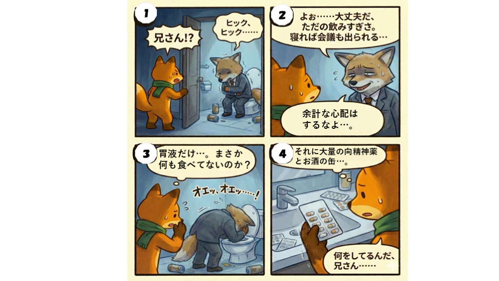 #12. キツネ薬剤師はアルコールと向精神薬が原因とにらみ、兄の飲酒と薬を完璧に管理した。 ?