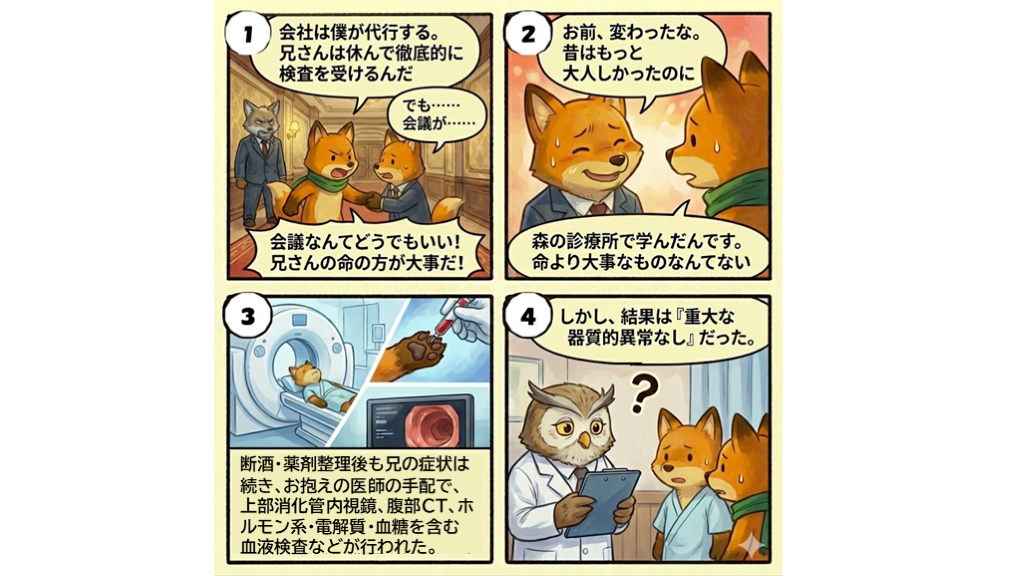 #13. 断酒・薬剤整理後も兄の症状は続き、お抱えの医師の手配で、上部消化管内視鏡、腹部CT、ホルモン系・電解質・血糖を含む血液検査などが行われた。