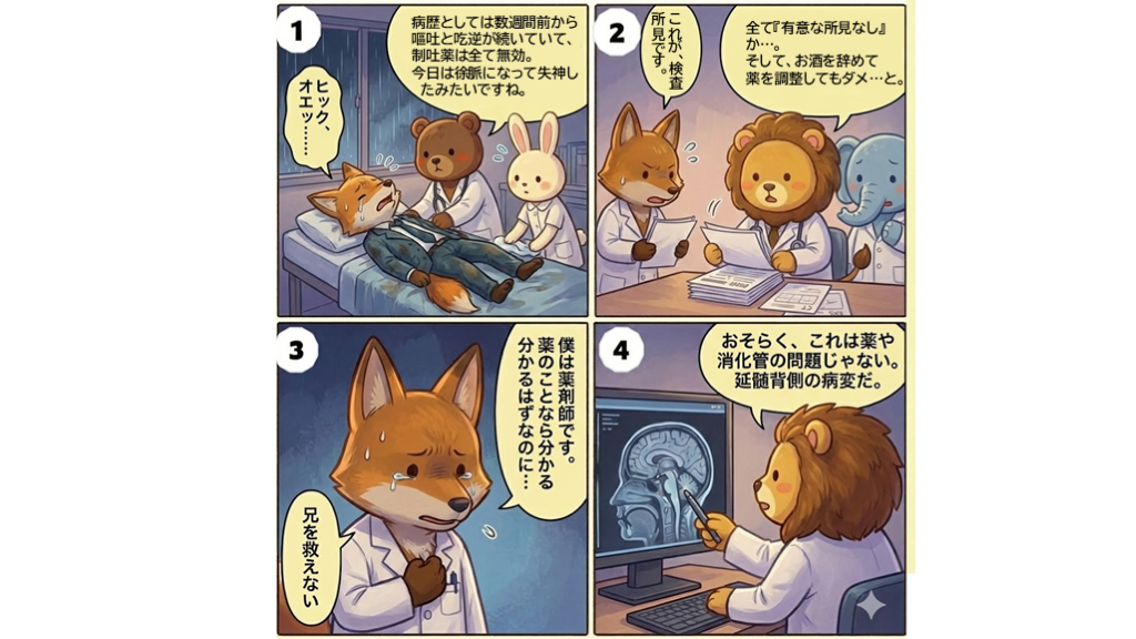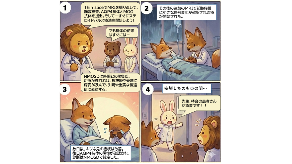 治療が遅れれば、視神経や脊髄に病変が及んで、失明や重篤な後遺症に直結する。 その後の追加のMRIで延髄背側に小さな信号変化が確認され治療が開始された。 先生、待合の患者さんが急変です!! 安堵したのも束の間… 数日後、キツネ兄の症状は改善。