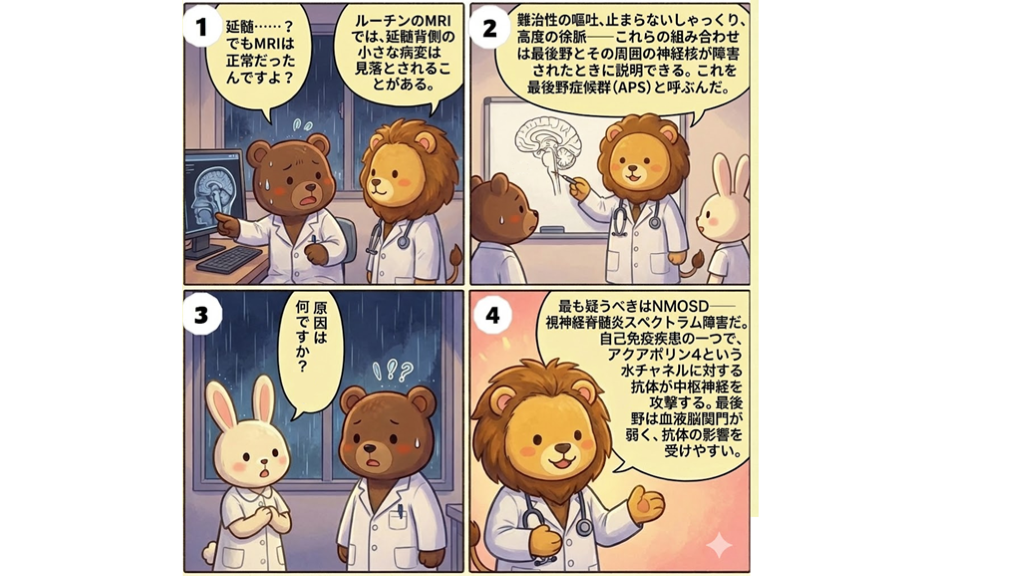 後日AQP4抗体の陽性が確認され、診断はNMOSDで確定した。