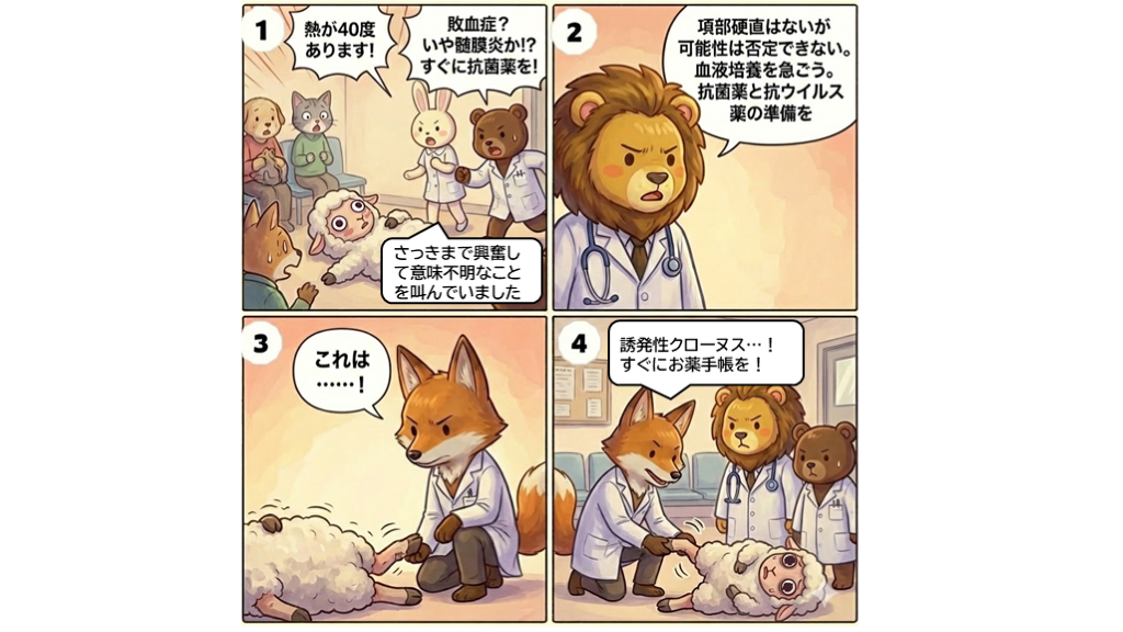 #22. さっきまで興奮して意味不明なことを叫んでいました 誘発性クローヌス…!すぐにお薬手帳を!
