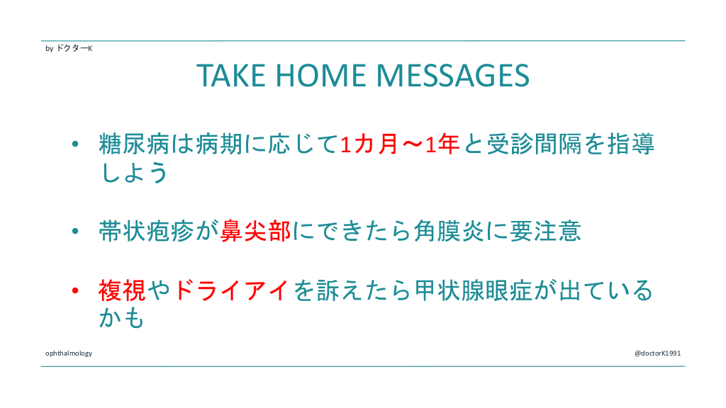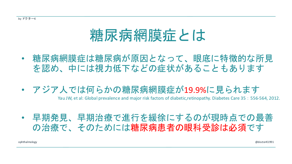 by ドクターK 糖尿病網膜症とは • 糖尿病網膜症は糖尿病が原因となって、眼底に特徴的な所見 を認め、中には視力低下などの症状があることもあります • アジア人では何らかの糖尿病網膜症が19.9%に見られます Yau JW, et al: Global prevalence and major risk factors of diabetic,retinopathy. Diabetes Care 35:556-564, 2012. • 早期発見、早期治療で進行を緩徐にするのが現時点での最善 の治療で、そのためには糖尿病患者の眼科受診は必須です ophthalmology @doctorK1991