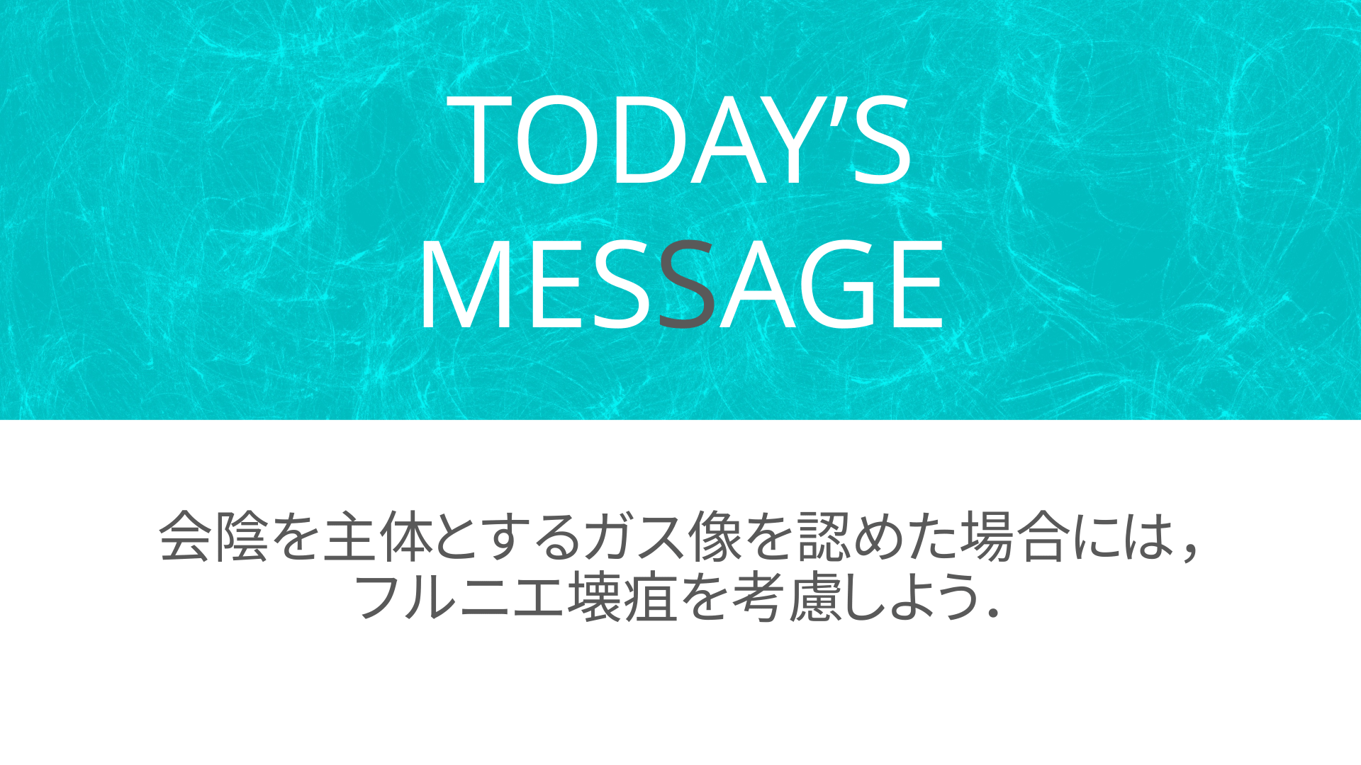 #15. TODAY’S MESSAGE 会陰を主体とするガス像を認めた場合には, フルニエ壊疽を考慮しよう.