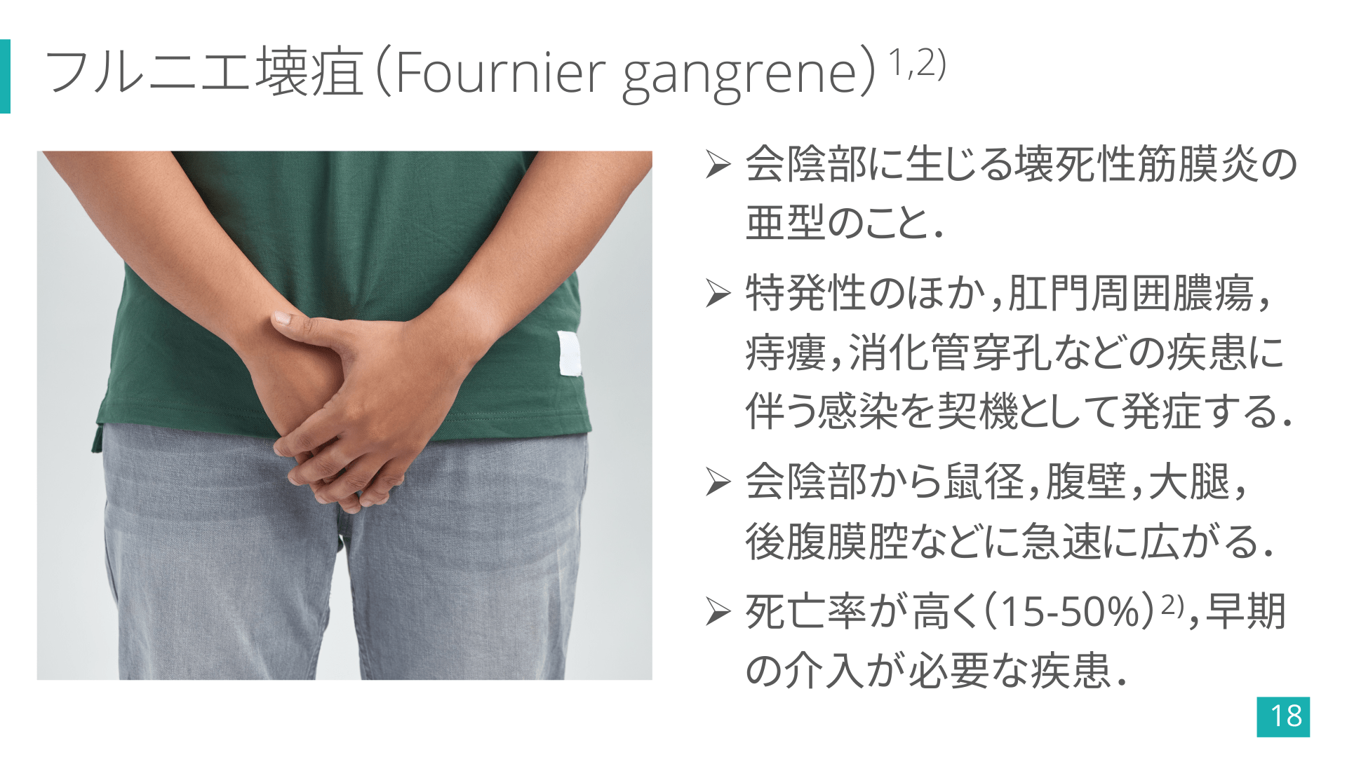 #18. フルニエ壊疽(Fournier 1,2) gangrene) Ø 会陰部に生じる壊死性筋膜炎の 亜型のこと. Ø 特発性のほか,肛門周囲膿瘍, 痔瘻,消化管穿孔などの疾患に 伴う感染を契機として発症する. Ø 会陰部から鼠径,腹壁,大腿, 後腹膜腔などに急速に広がる. Ø 死亡率が高く(15-50%)2),早期 の介入が必要な疾患. 18