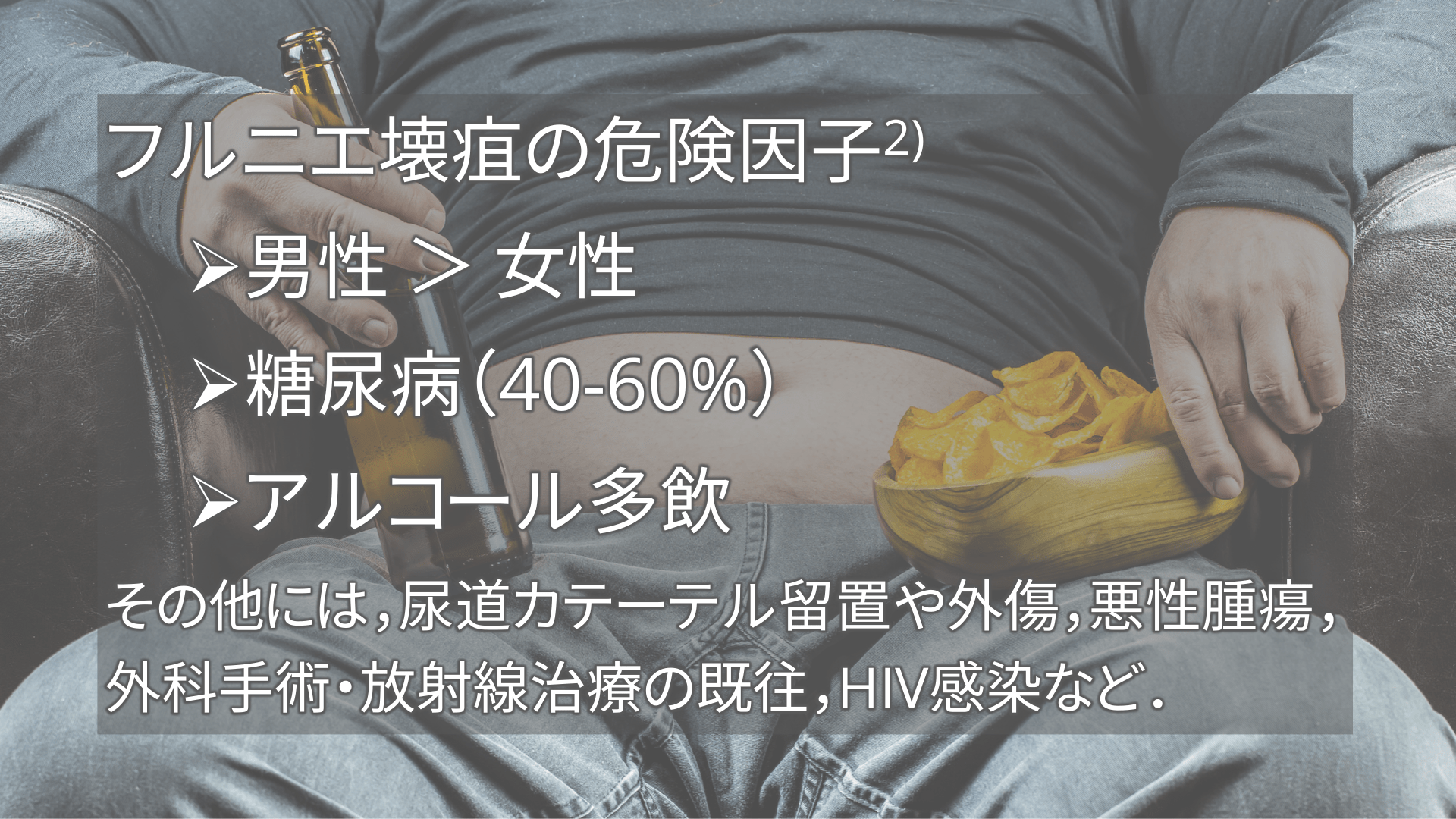 #19. 2) フルニエ壊疽の危険因子 Ø男性 > 女性 Ø糖尿病(40-60%) Øアルコール多飲 その他には,尿道カテーテル留置や外傷,悪性腫瘍, 外科手術・放射線治療の既往,HIV感染など.