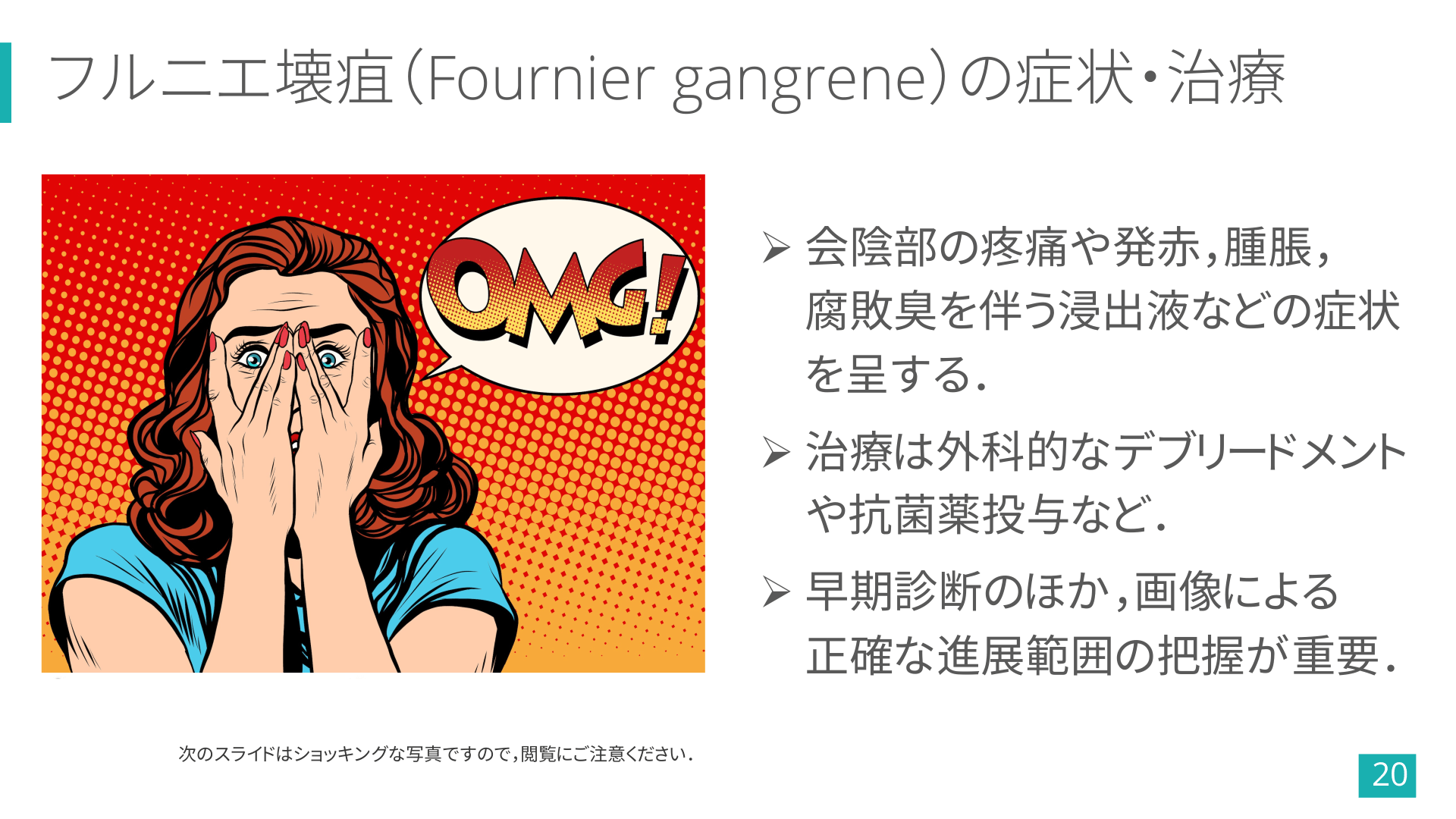 #20. フルニエ壊疽(Fournier gangrene)の症状・治療 Ø 会陰部の疼痛や発赤,腫脹, 腐敗臭を伴う浸出液などの症状 を呈する. Ø 治療は外科的なデブリードメント や抗菌薬投与など. Ø 早期診断のほか,画像による 正確な進展範囲の把握が重要. 次のスライドはショッキングな写真ですので,閲覧にご注意ください. 20