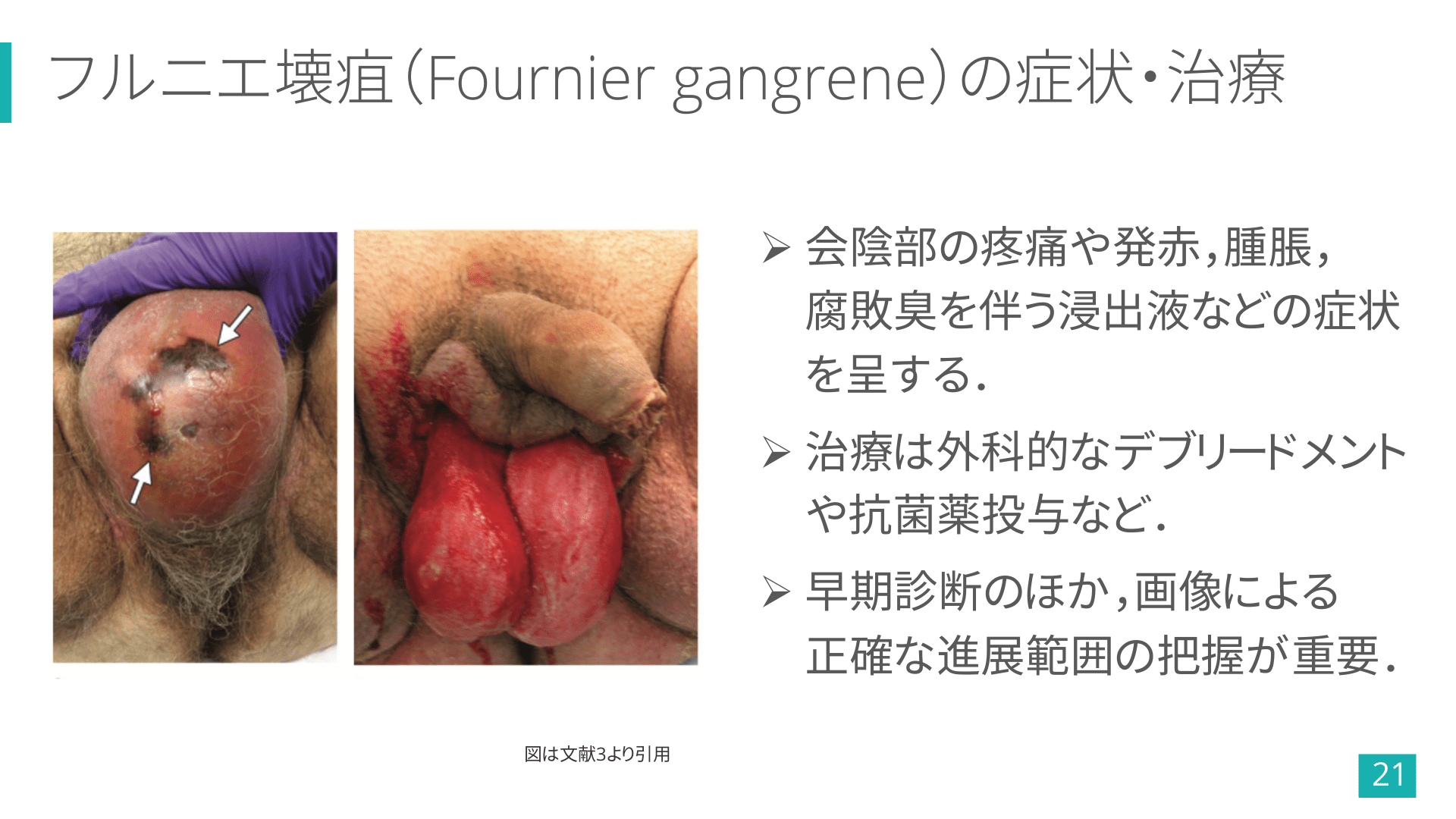 #21. フルニエ壊疽(Fournier gangrene)の症状・治療 Ø 会陰部の疼痛や発赤,腫脹, 腐敗臭を伴う浸出液などの症状 を呈する. Ø 治療は外科的なデブリードメント や抗菌薬投与など. Ø 早期診断のほか,画像による 正確な進展範囲の把握が重要. 図は文献3より引用 21